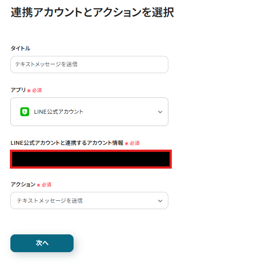 連携アカウントとアクションを選択する画面が表示されるので、今回連携するLINE公式アカウントのアカウントを確認し「次へ」をクリックします。