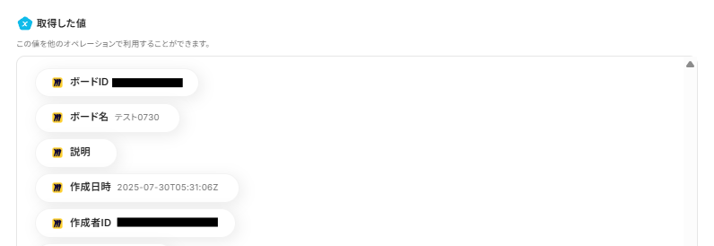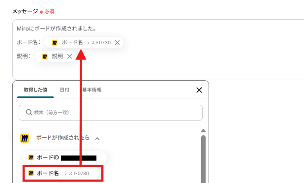 以下のようにMiroの取得した値を利用し、ボード名などをメッセージに入力しましょう。