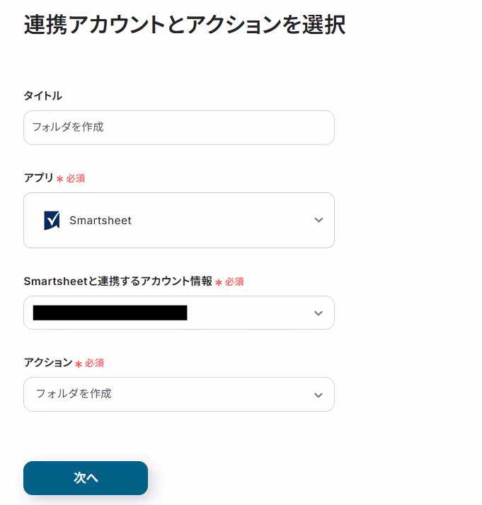 連携アカウントとアクションを選択する画面が表示されるので、今回連携するSmartsheetのアカウントを確認し「次へ」をクリックします。