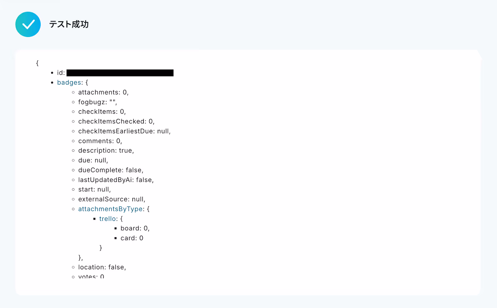 入力が完了したら「テスト」をクリックして、設定した内容でTrelloにカードが作成されるか確認しましょう。