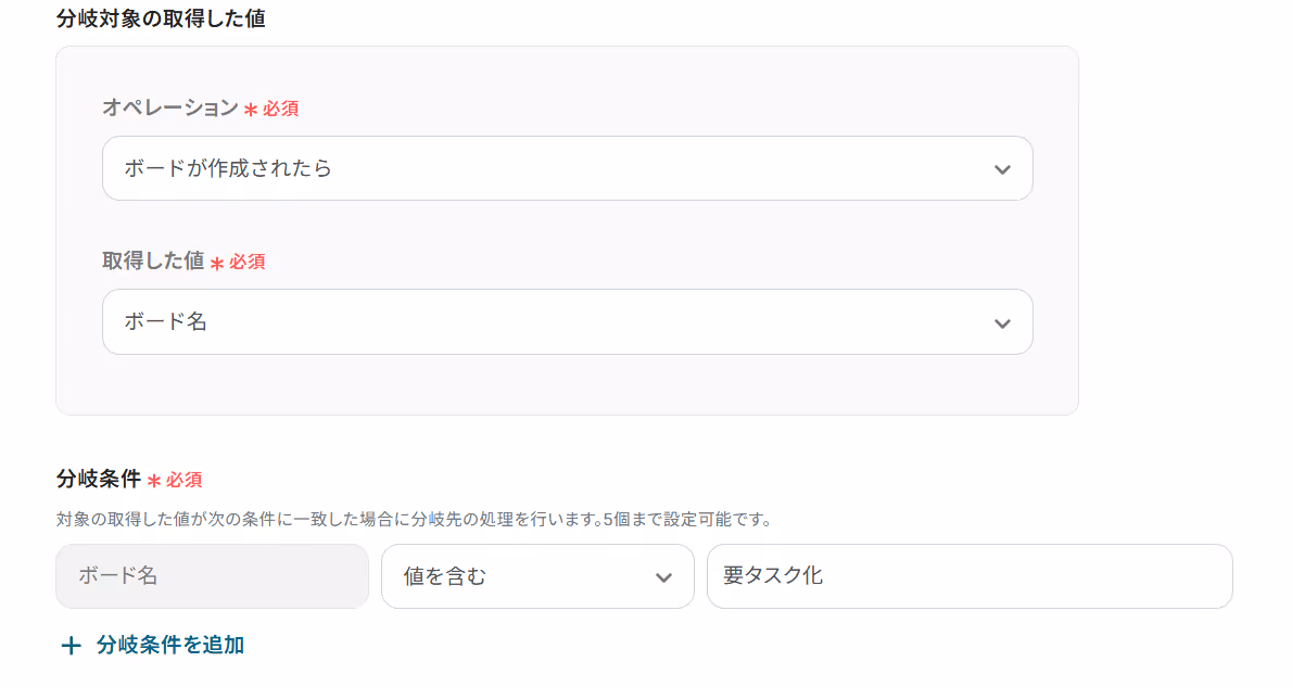 下記のように設定することで、ボード名に特定の値(要タスク化 など)が含まれる場合にのみフローが先に進むようになります。