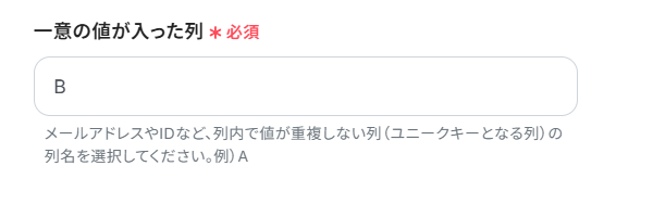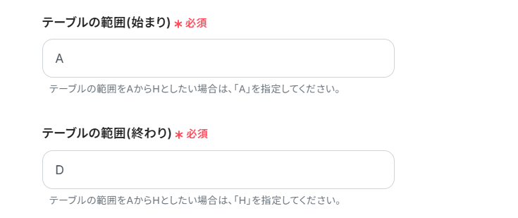 この場合、テーブル範囲の始まりは「A」、終わりは「D」になるため、以下のようにYoomに入力しましょう。