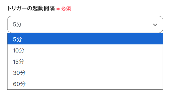 - トリガーの起動タイミングは、5分、10分、15分、30分、60分のいずれかで設定できます。