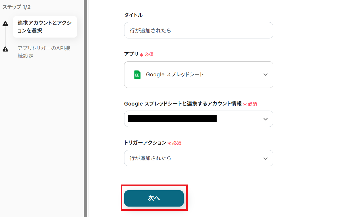 タイトルを任意で設定したら、Google スプレッドシートと連携しているアカウントやトリガーアクションの内容を確認して「次へ」をクリックしてください。