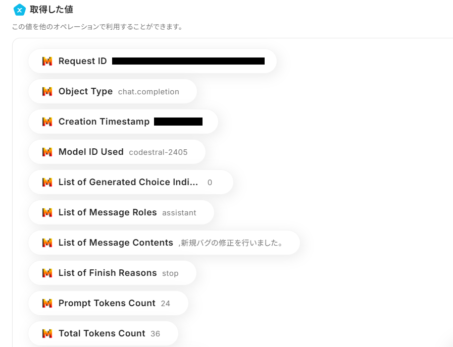 ・Mistar AIのアウトプットはJSONPathから取得できます。詳細は下記をご参照ください。