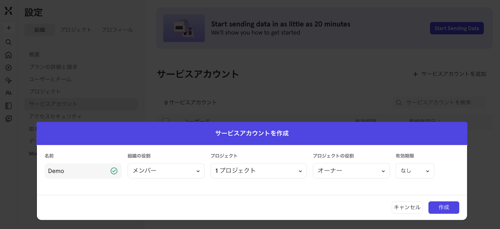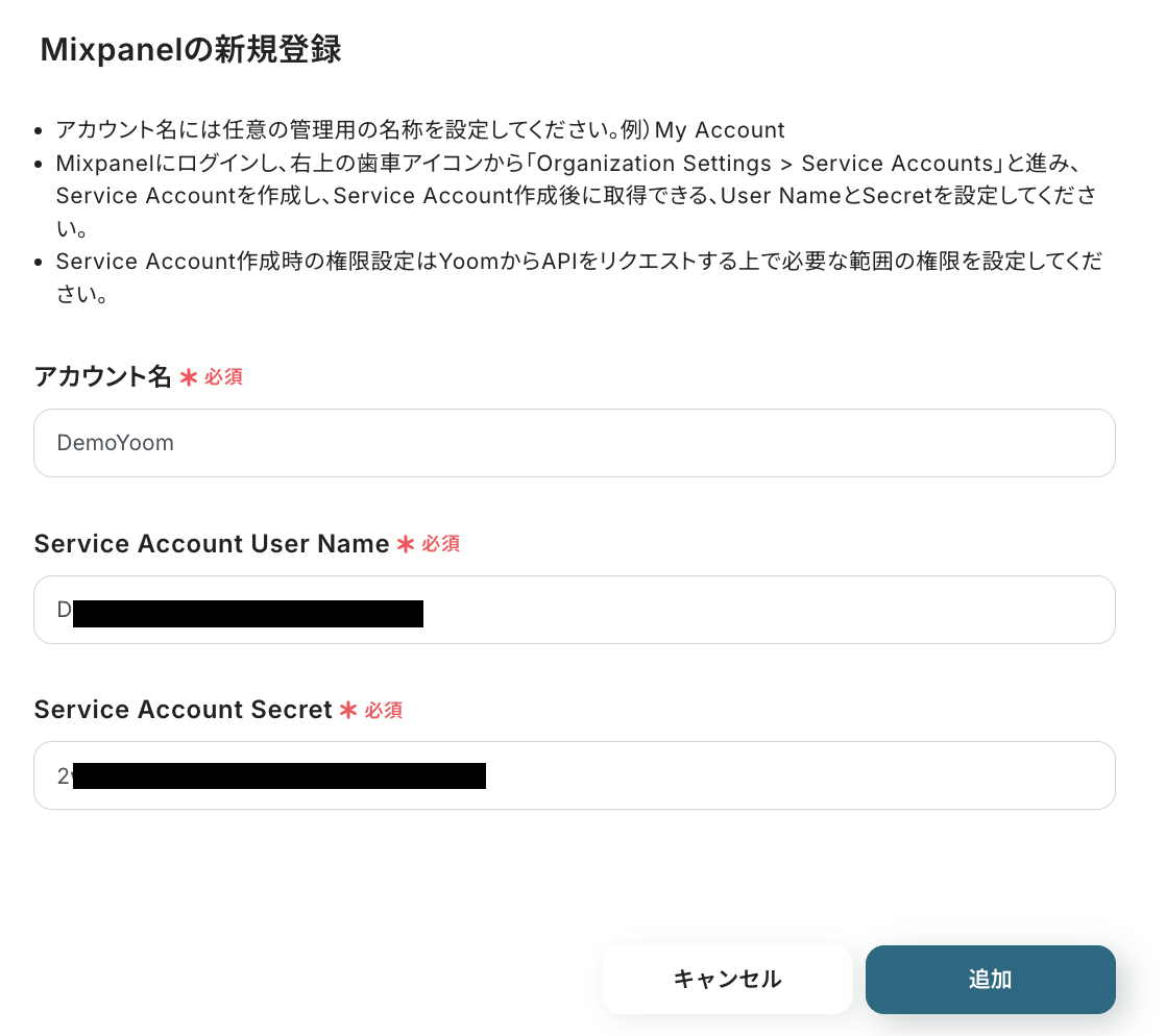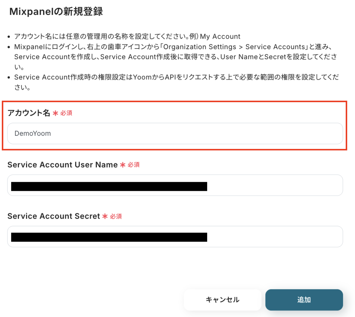 「Service Account User Name」と「Service Account Secret」は、Mixpanelアカウントから値を取得して入力します。
