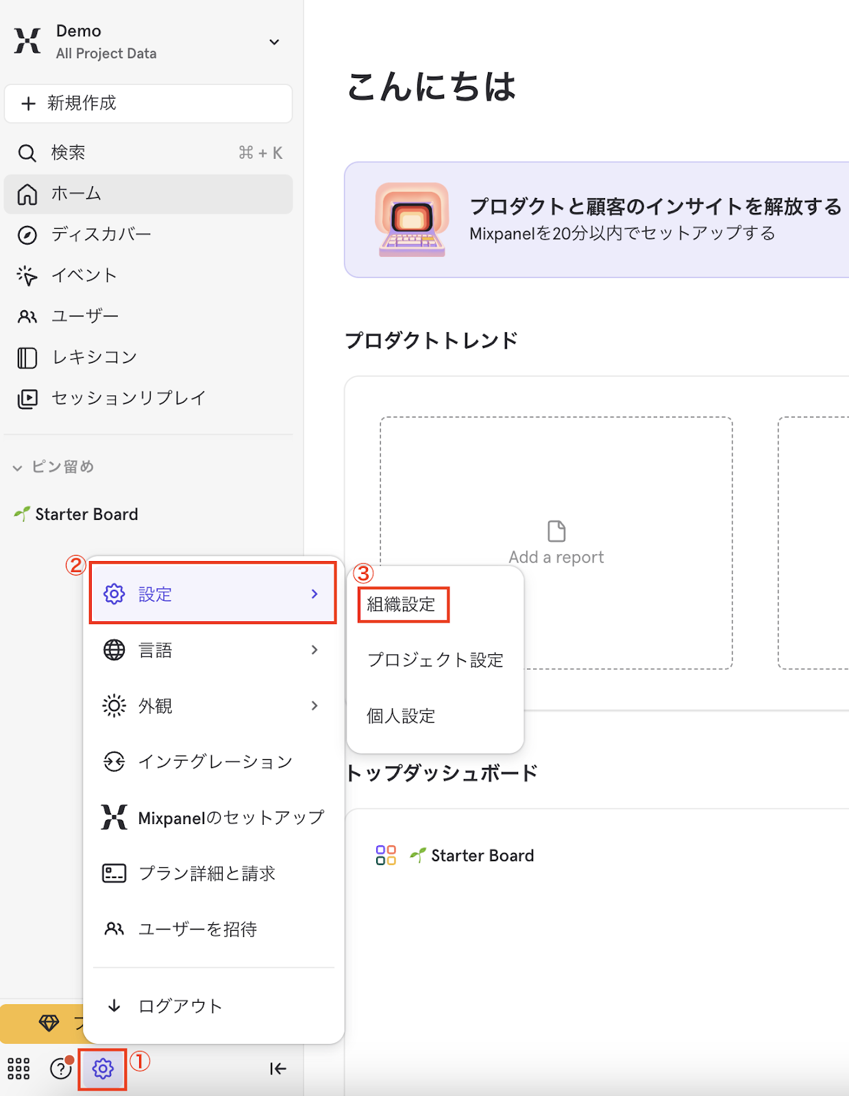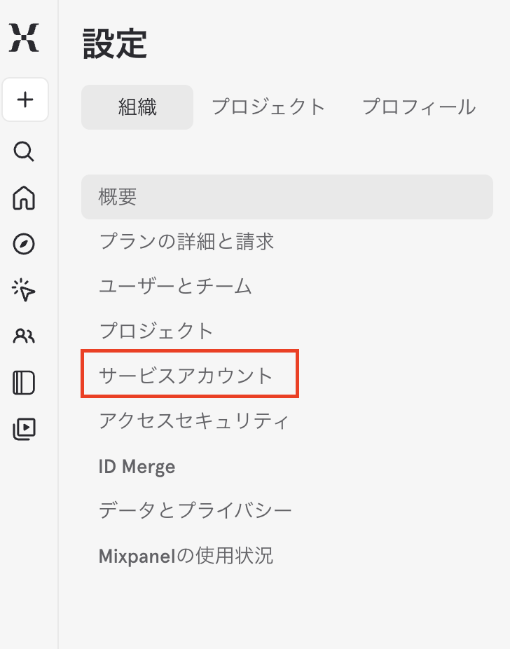 こちらからYoomと連携するMixpanelアカウントにログインし、画面左下の歯車マークから、設定、組織設定の順に進んでください。