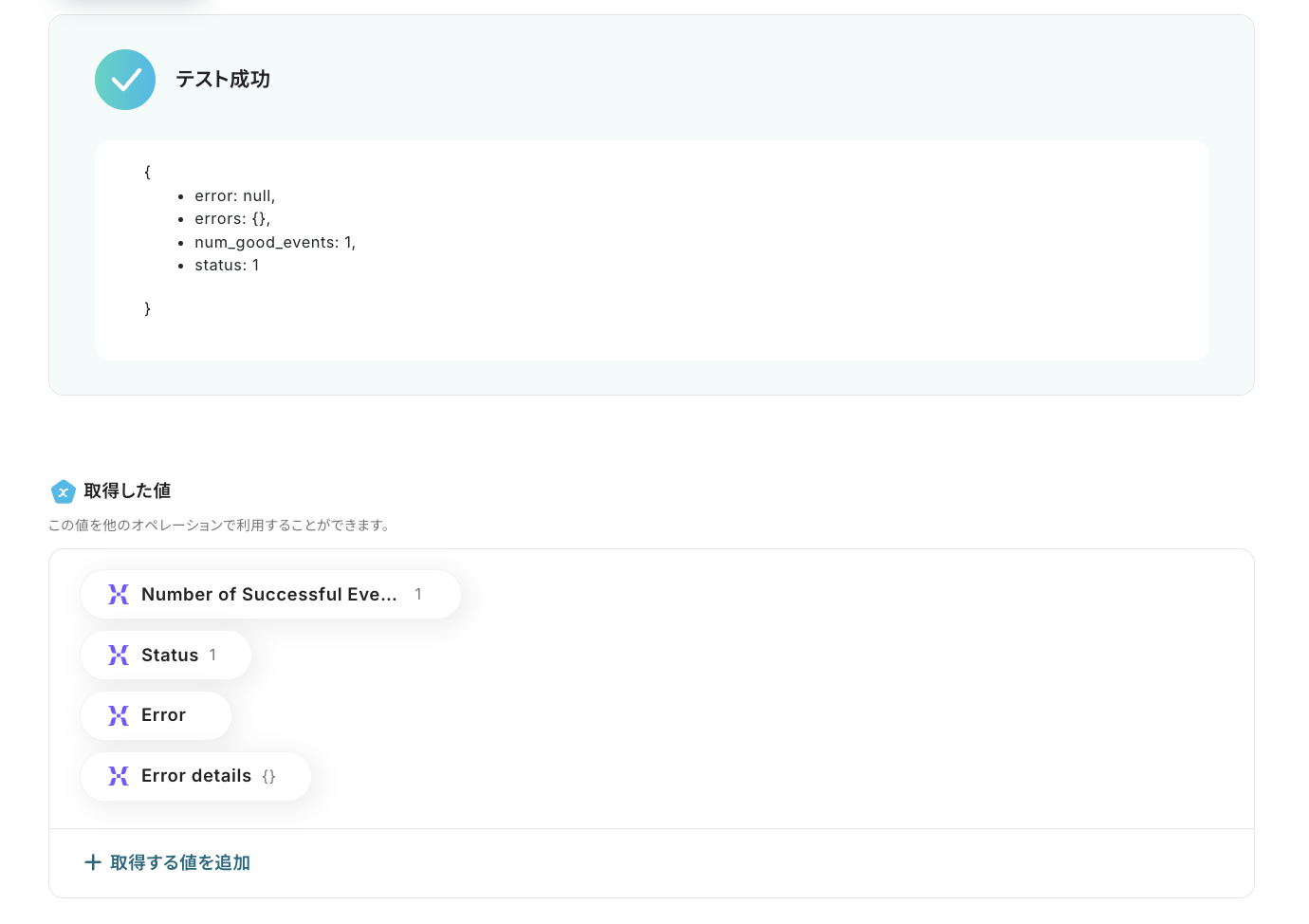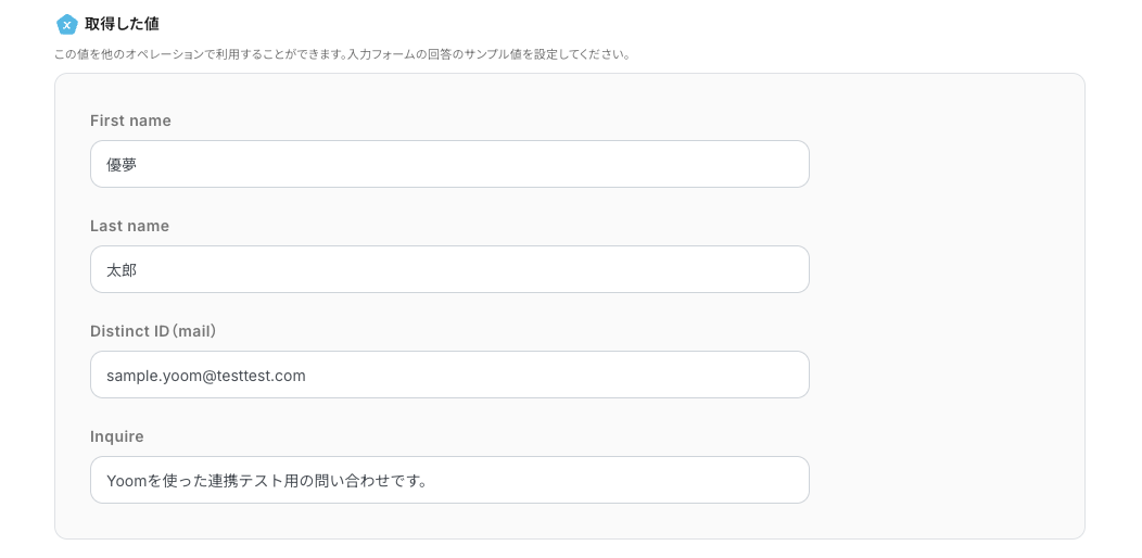 このように「取得した値」を用いることで、固定値ではなくフォームの回答データをそのまま引用してMixpanelにプロフィールを自動作成できるようになりますよ!