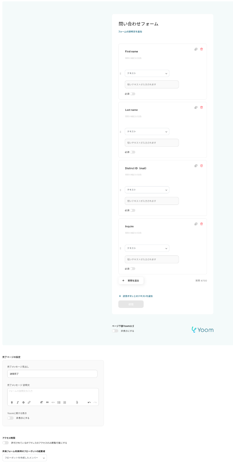Yoomフォームの作成画面が表示されるので、「氏名」や「メールアドレス」など、MixpanelとHubSpotにデータを登録する際に必要な項目を設定しましょう。