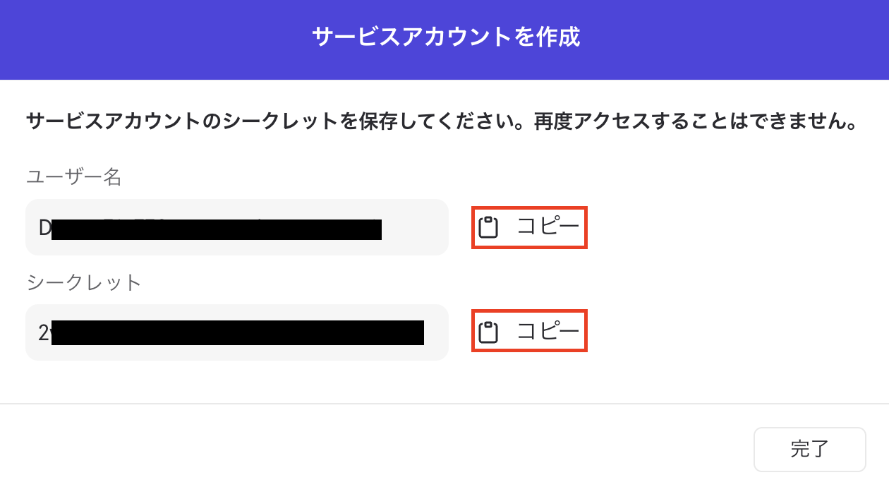 アカウントを作成すると「ユーザー名」と「シークレット」が表示されるので、それぞれの値をコピーし、Yoomのマイアプリ登録画面に戻ります。
