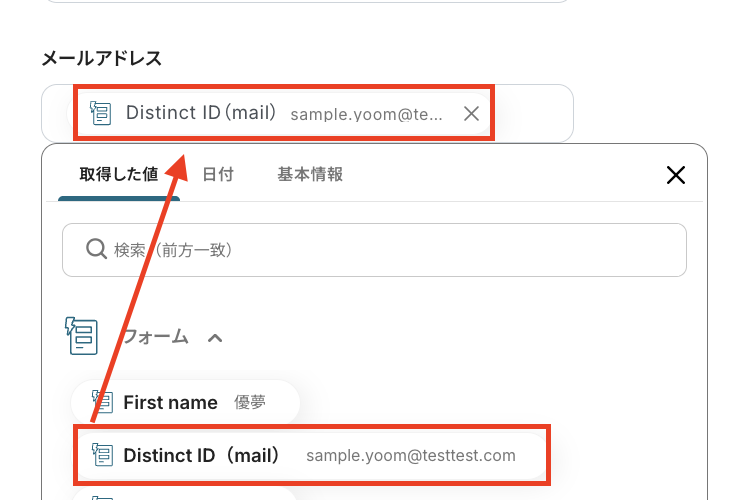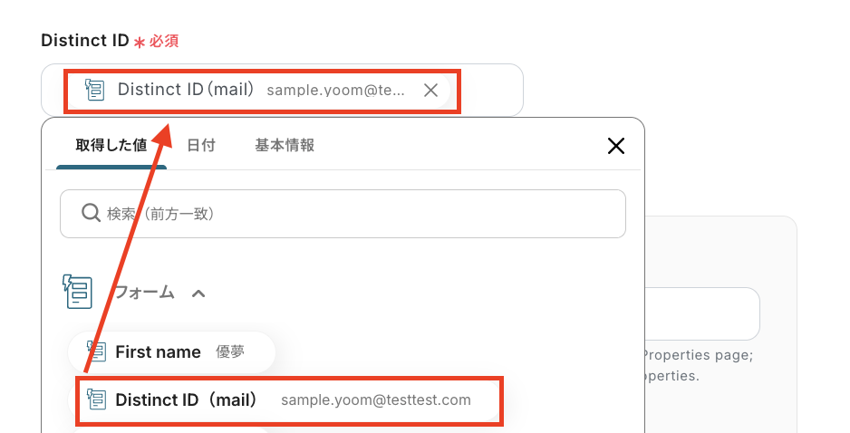 Distinct ID:下図のように、ステップ3で「取得した値」を使って設定しましょう。