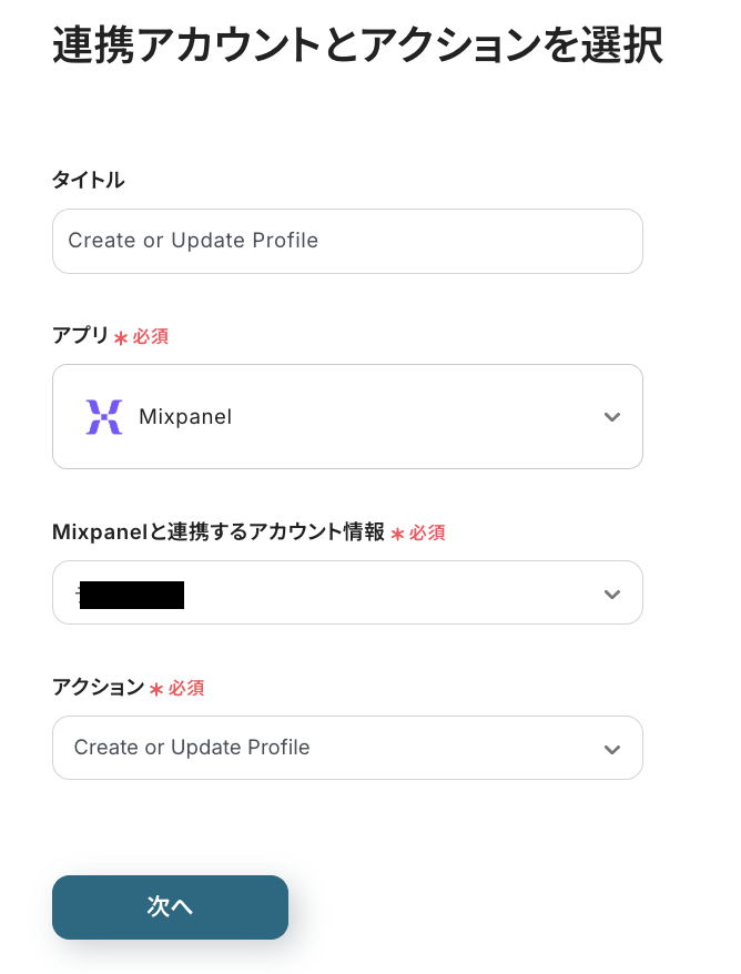 続いて、フォームに送信された回答データを使って、Mixpanelにプロフィールを作成する設定を行います。