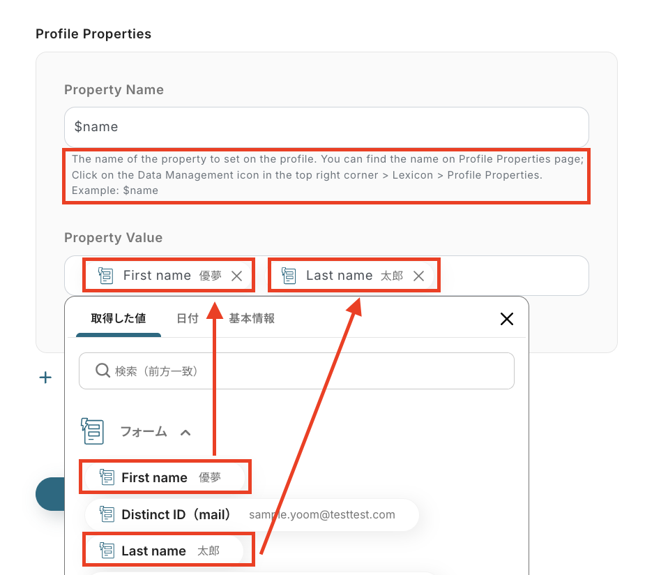 Profile Properties:注釈を参考にしながら、「取得した値」を活用して設定してみてくださいね!