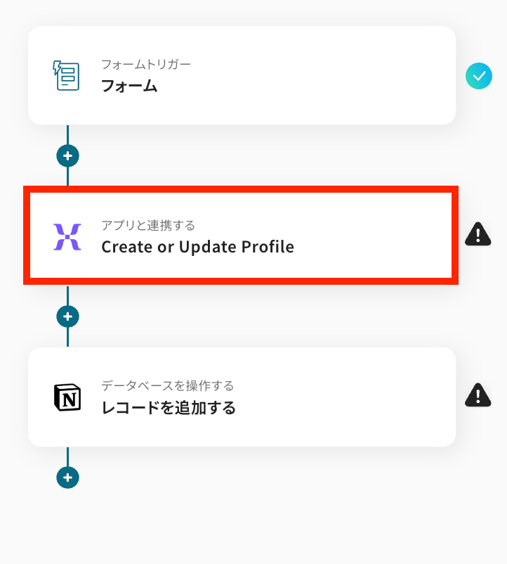 このワークフローを活用すれば、フォームへの回答送信をきっかけに、Mixpanelへのプロフィール作成とNotionへのレコード追加が自動で実行され、データ連携を効率化できます。