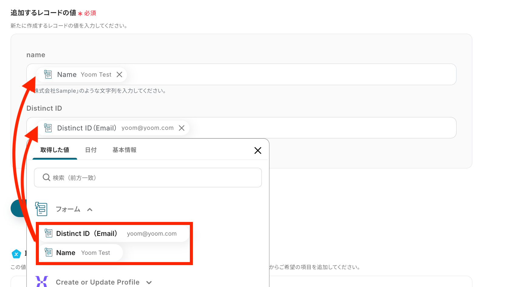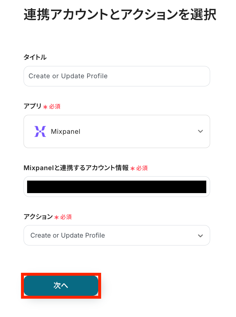 フォームの回答内容をトリガーとして、Mixpanelにプロフィールを作成する設定を行っていきます。