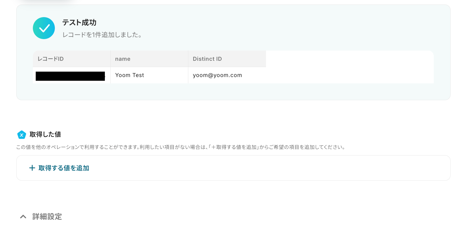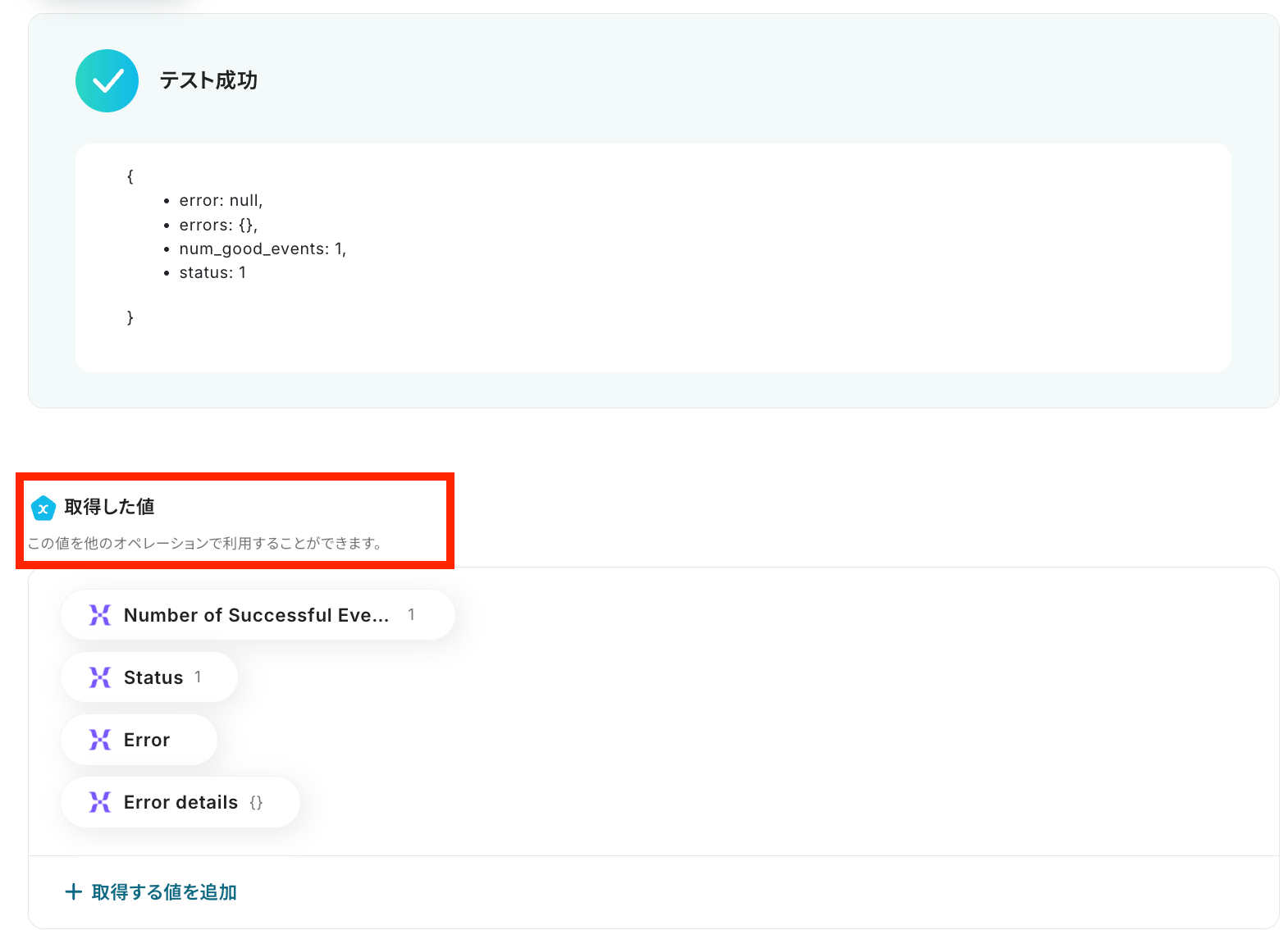 取得した値に入力したデータは、以降の設定でテストを行う際に各アプリに追加されます。