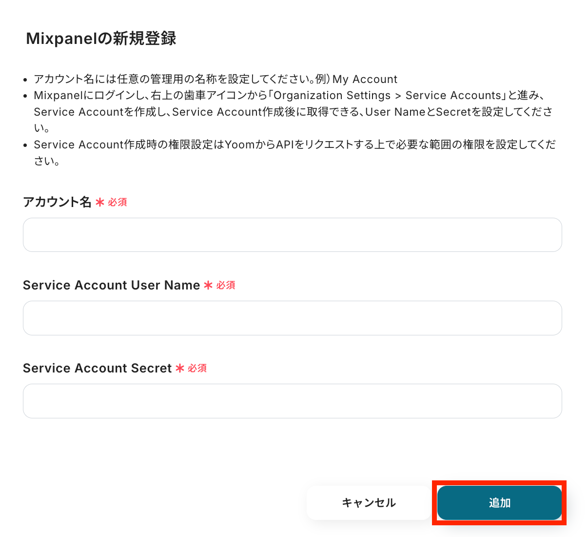 アカウント名を任意の名称で設定して、Mixpanel上で「User Name」と「Secret」を取得します。