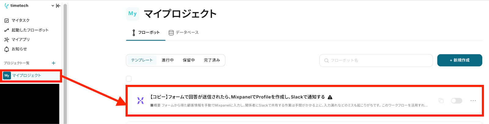 左側にあるメニューの「マイプロジェクト」から、コピーしたテンプレートを開きます。