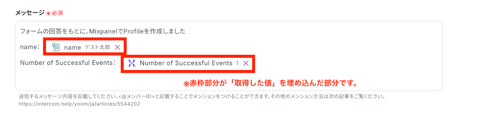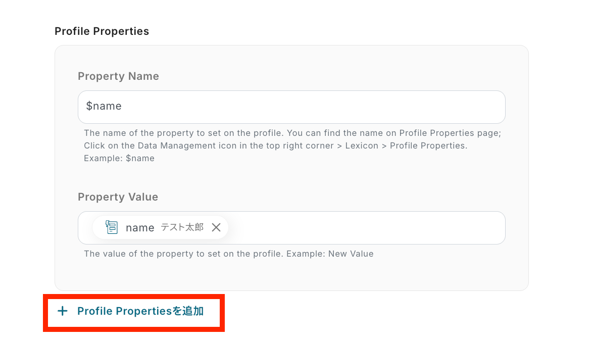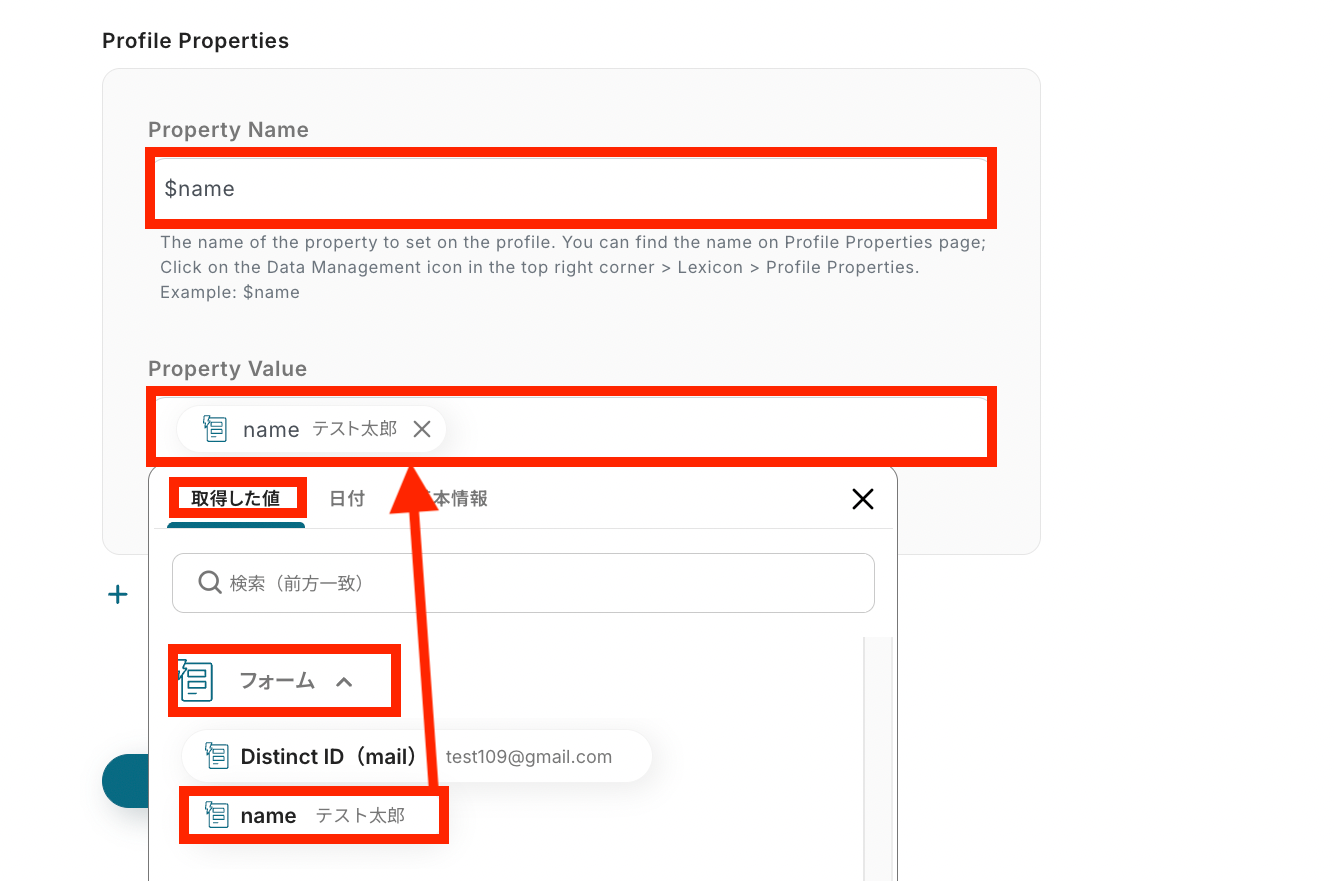 - Mixpanelのオペレーションでは、フォームで取得した値を引用し、プロファイルのフィールドを自由に設定することが可能です。