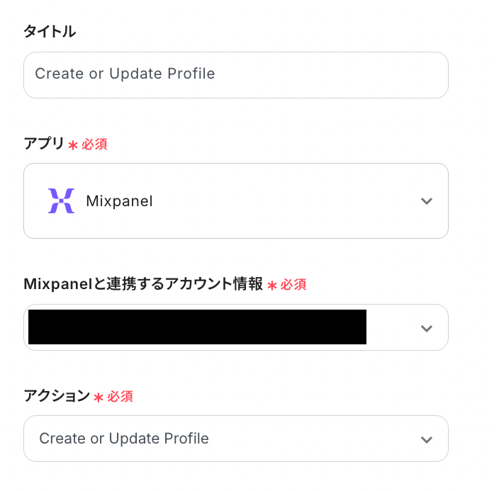 - 続いて、オペレーションでMixpanelを選択し、「Create or Update Profile」のアクションを設定して、フォームで取得した情報を紐付けます。