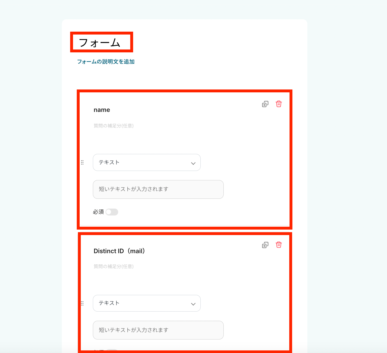 - トリガーとなるフォームでは、ユーザー情報を取得するために必要な回答項目を任意で設定してください。