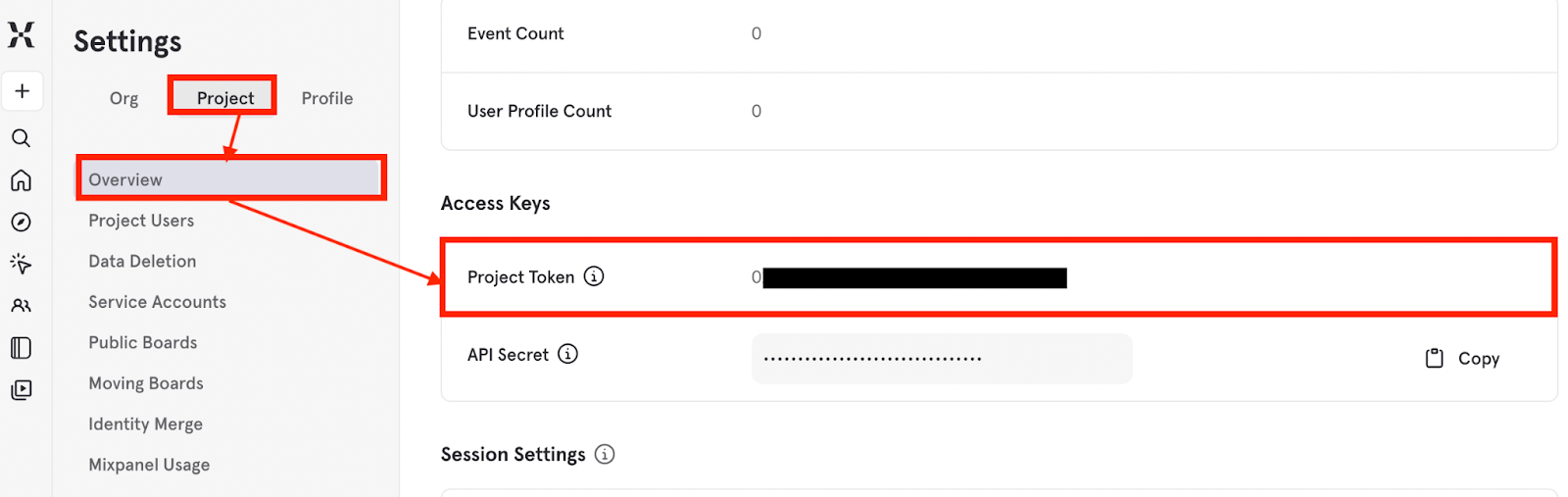「Project token」は、MixpanelのSettings画面から確認できます。