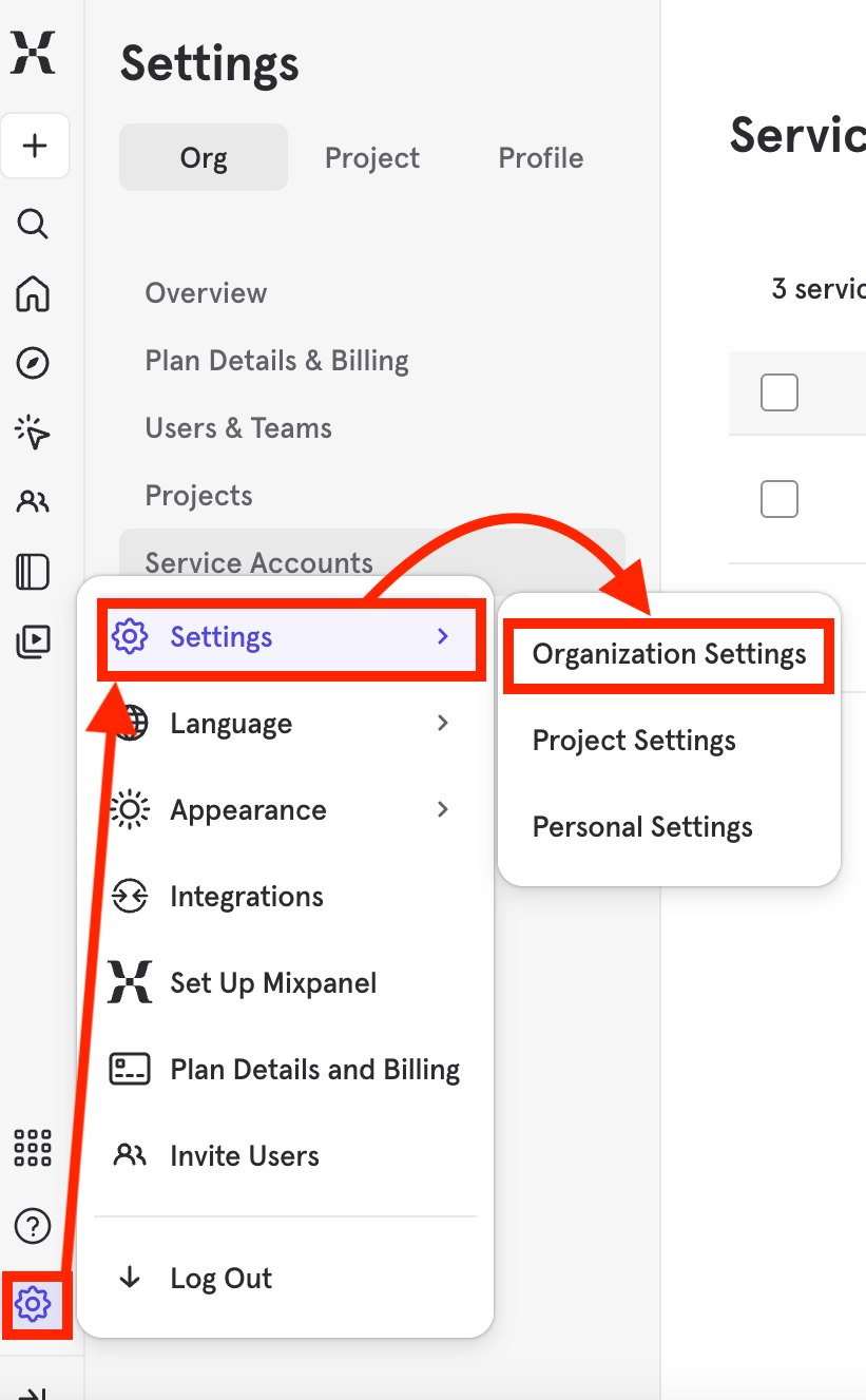 「Servis Account User Name」と「Servis Account Secret」は歯車ボタンから「Organization Settings」に進み「Servis Account」を作成することで取得できます。