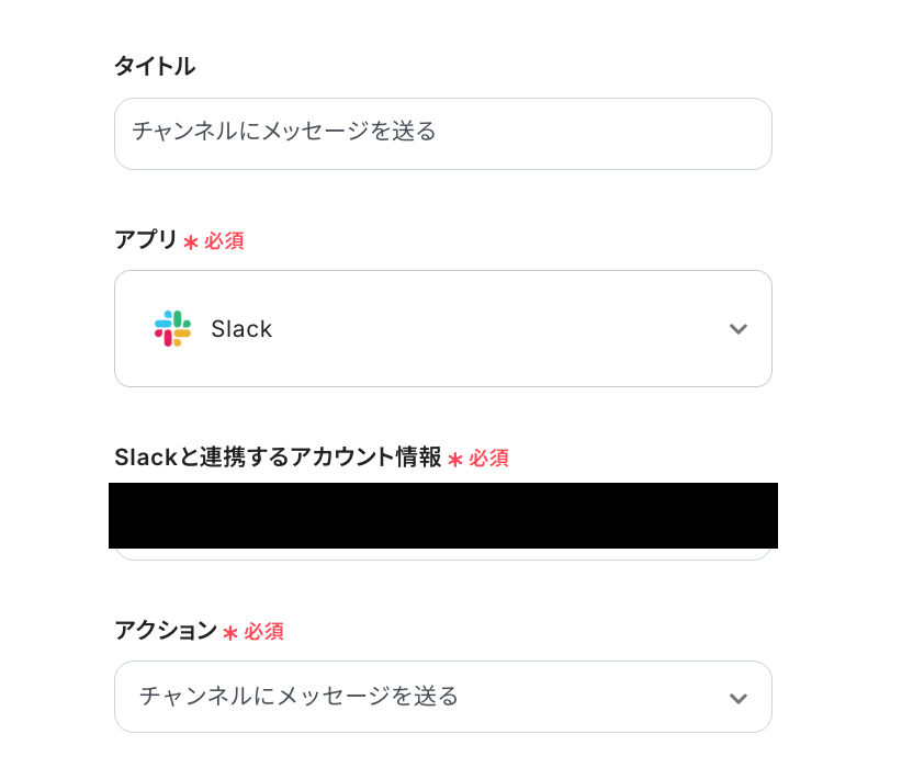 - 最後に、オペレーションでSlackを選択し、「チャンネルにメッセージを送る」アクションを設定し、指定したチャンネルに通知を送ります。