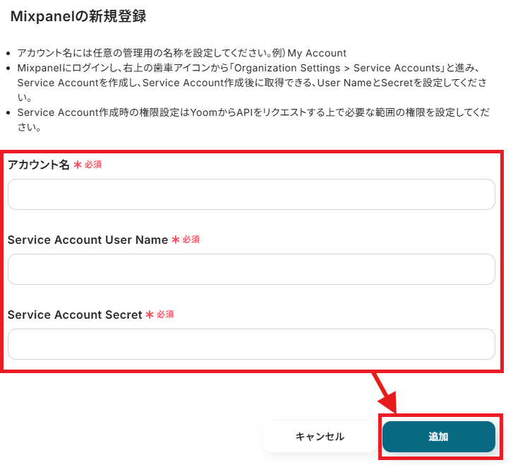 表示されている説明の通り手順を行い、アカウント名以下の部分を埋めていきます。入力が完了したら追加を押してください。