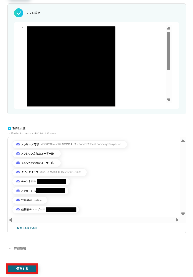 このワークフローを活用すれば、MOCOにコンタクトが作成されたことをトリガーに、指定したDiscordチャンネルへ自動で通知を送信できます。