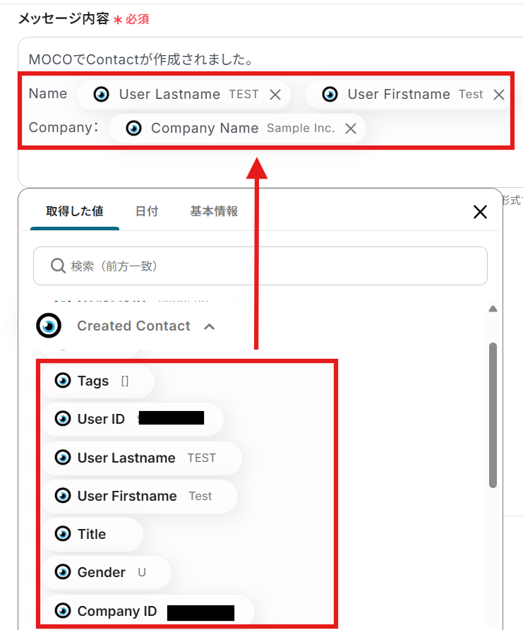 A:「会社名」や「電話番号」などをはじめ、MOCOに登録された情報であれば任意の項目を設定できます。