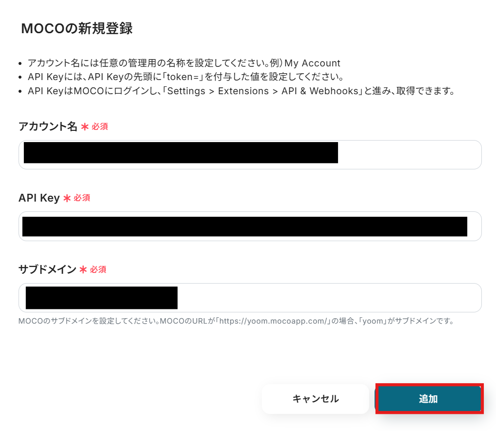 画面の案内に従ってアカウント名、API Key、サブドメインを入力します。