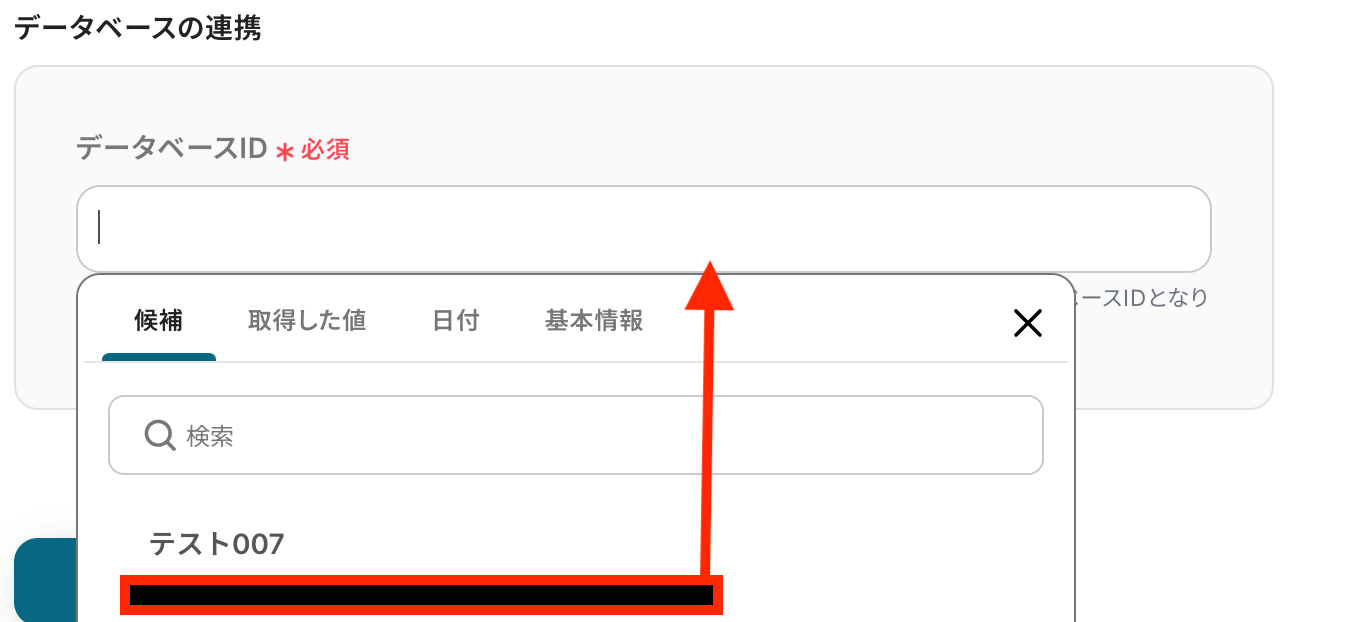 入力欄をクリックすると、前のステップで取得した値が表示されるので、そこから選択して設定できます。