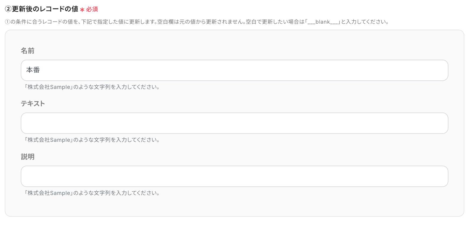 今回は、更新したいレコードの条件として設定した「名前」を「テスト」から「本番」に更新します。