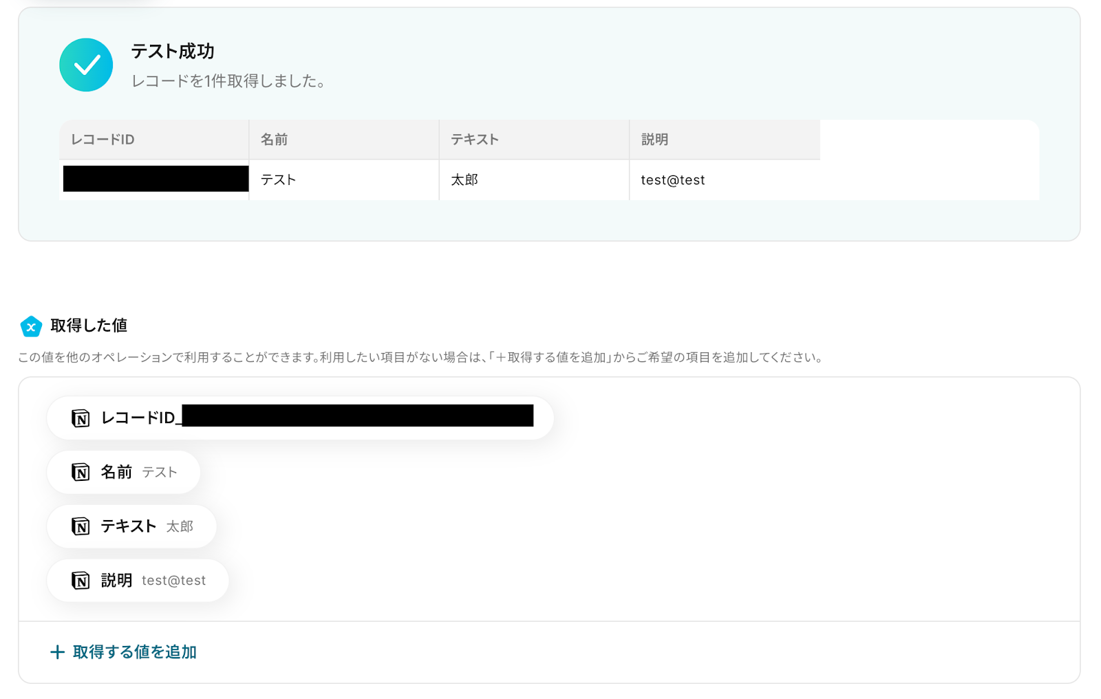 テストが成功すると、Notionから取得したレコードの内容が一覧で表示されます。