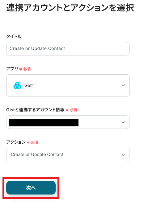 連携アカウントと該当アクションを確認し、問題なければ「次へ」進みます。