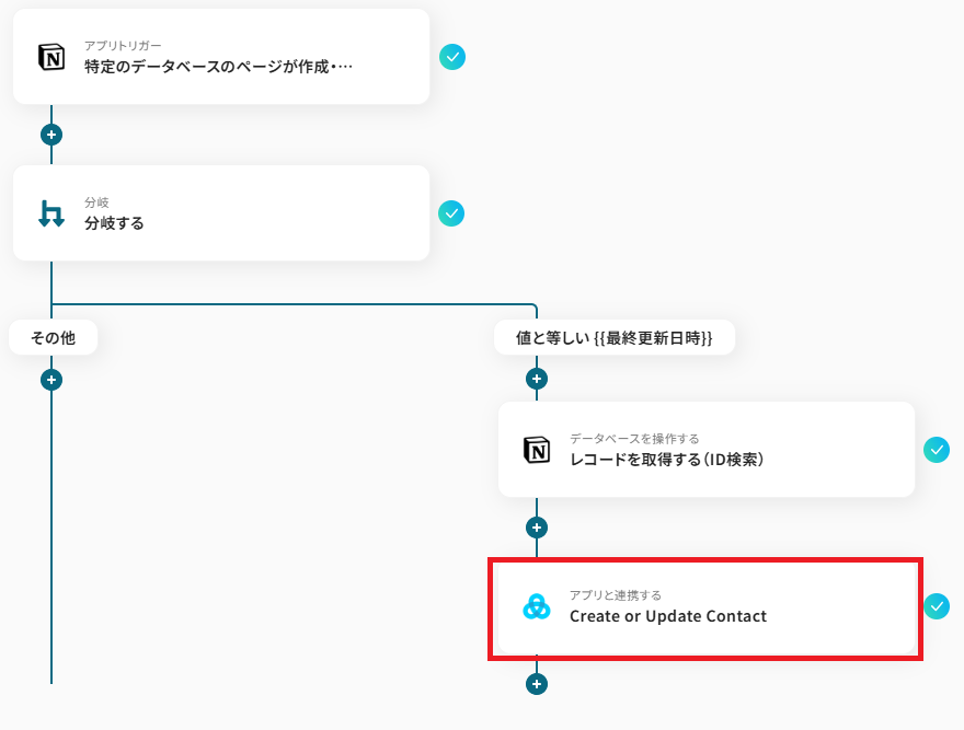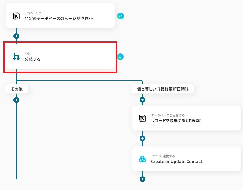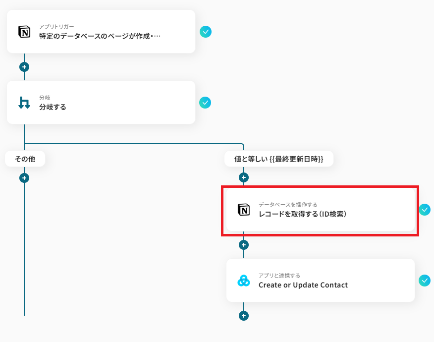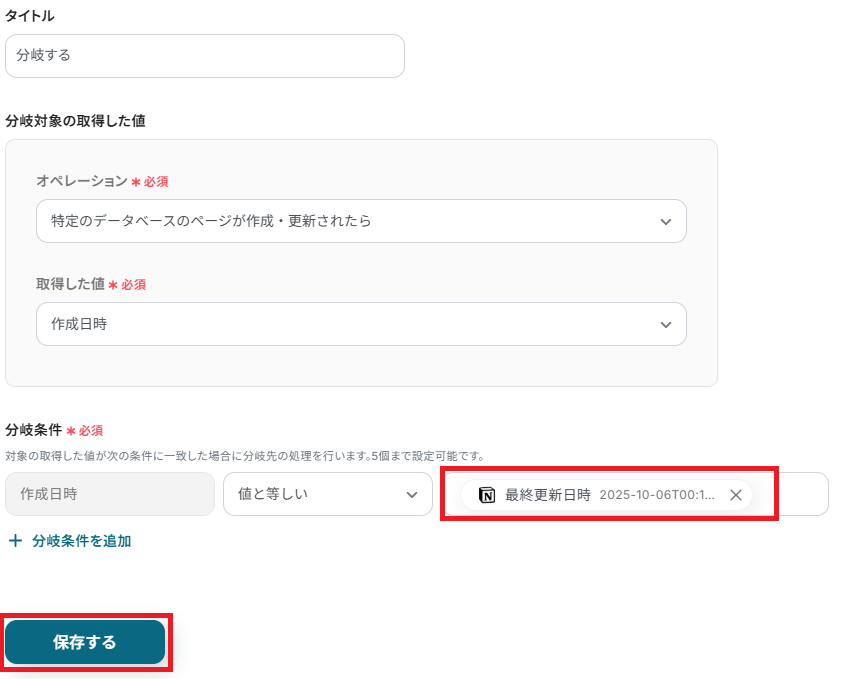 「タイトル」「分岐対象の取得した値」はそのままで、「分岐条件」の作成日時と等しくなっている部分が、前段階で抽出した「最終更新日時」になっているか確認してください。
