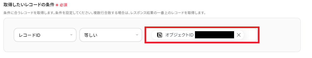 「取得したいレコードの条件」を「レコードID」「等しい」「オブジェクトID」に設定します。