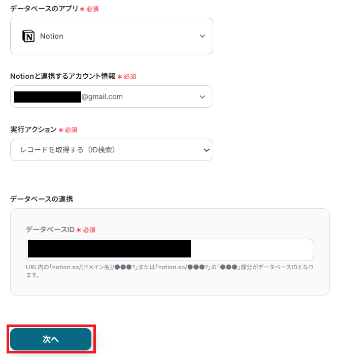 連携先アカウントを確認し、脚注を参考にデータベースIDを入力します。