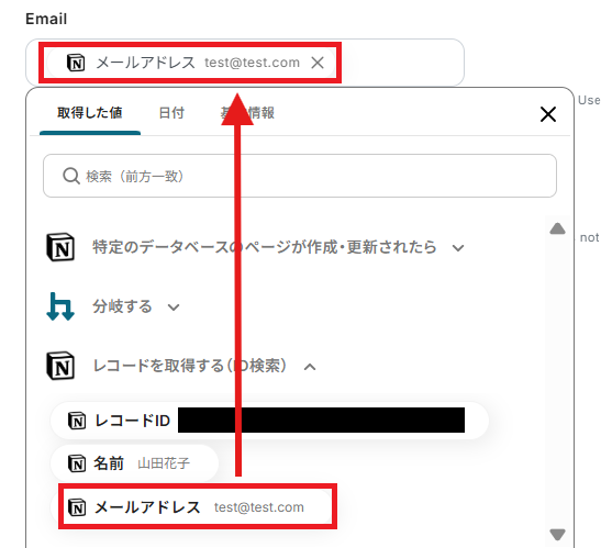 今回はNotionから抽出した名前とメールアドレスを入力しました。