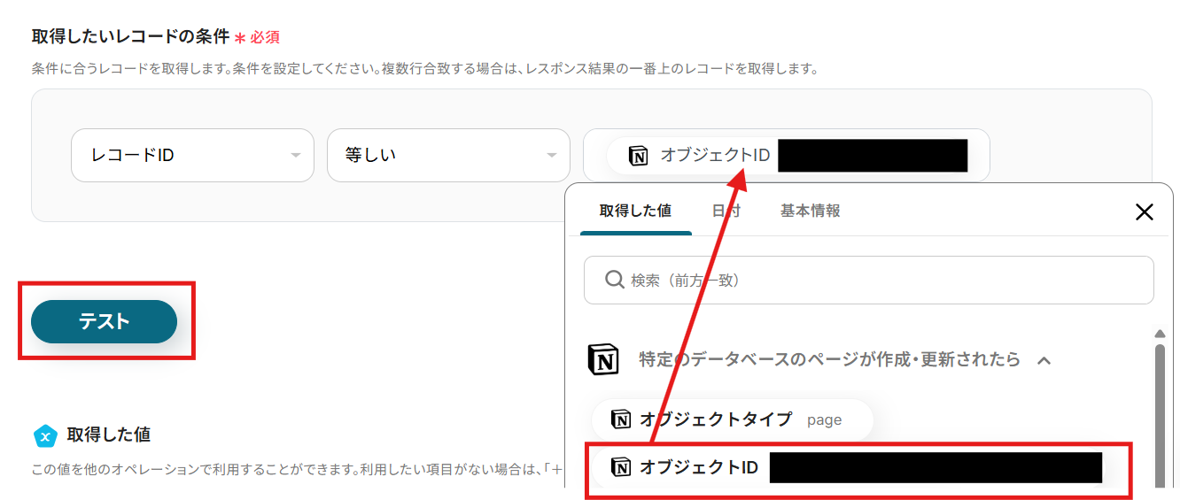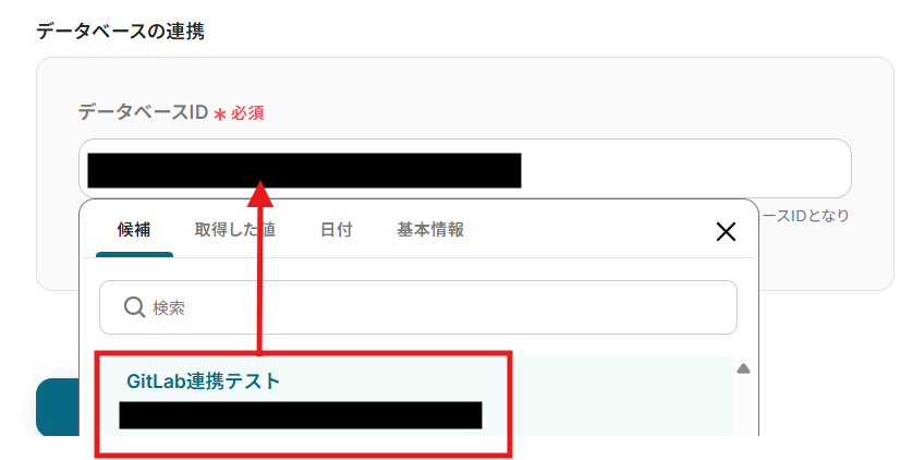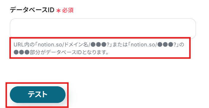 赤枠内の説明を参考に連携したいデータベースのIDを入力した後、「テスト」をクリックします。