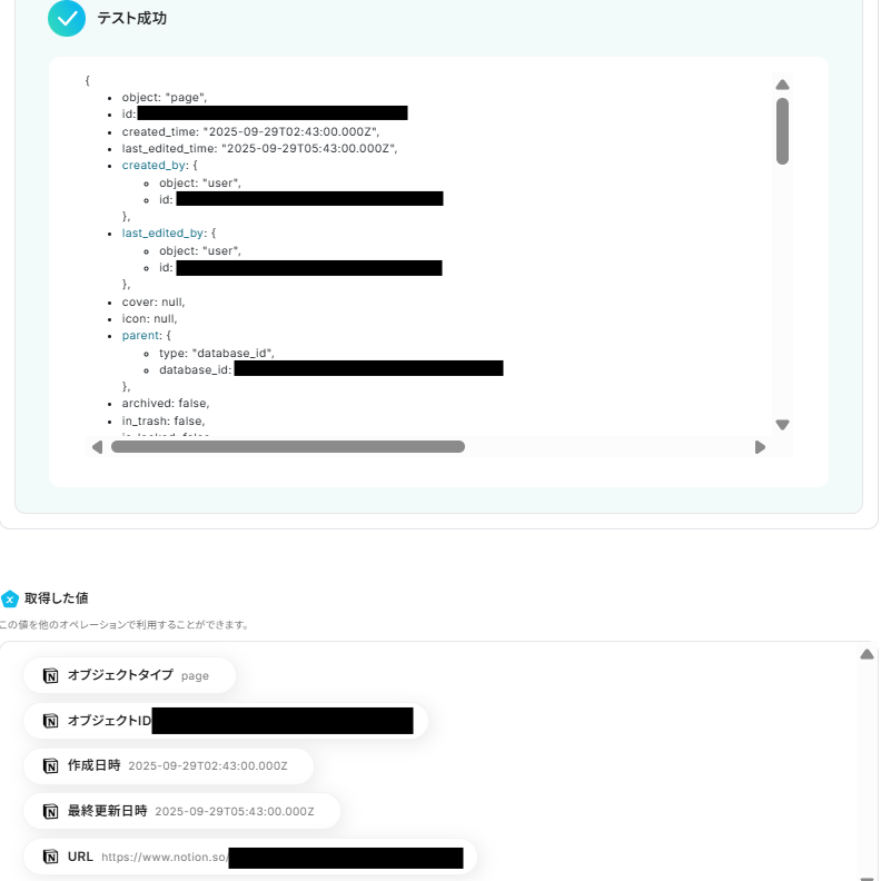 テストに成功すると、取得した値の各項目の横にNotionに追加したタスクの詳細情報が表示されます。