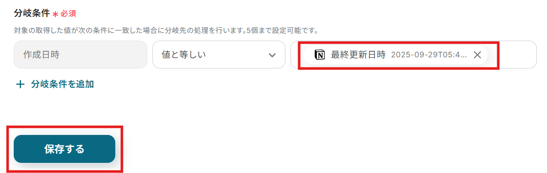 分岐条件もテンプレートであらかじめ設定されているので、下記条件のまま「保存する」をクリックして完了です!
