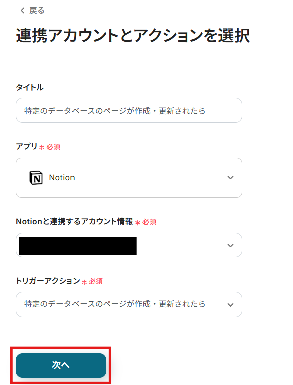 トリガーアクションは、「特定のデータベースのページが作成・更新されたら」のままで次に進みましょう!