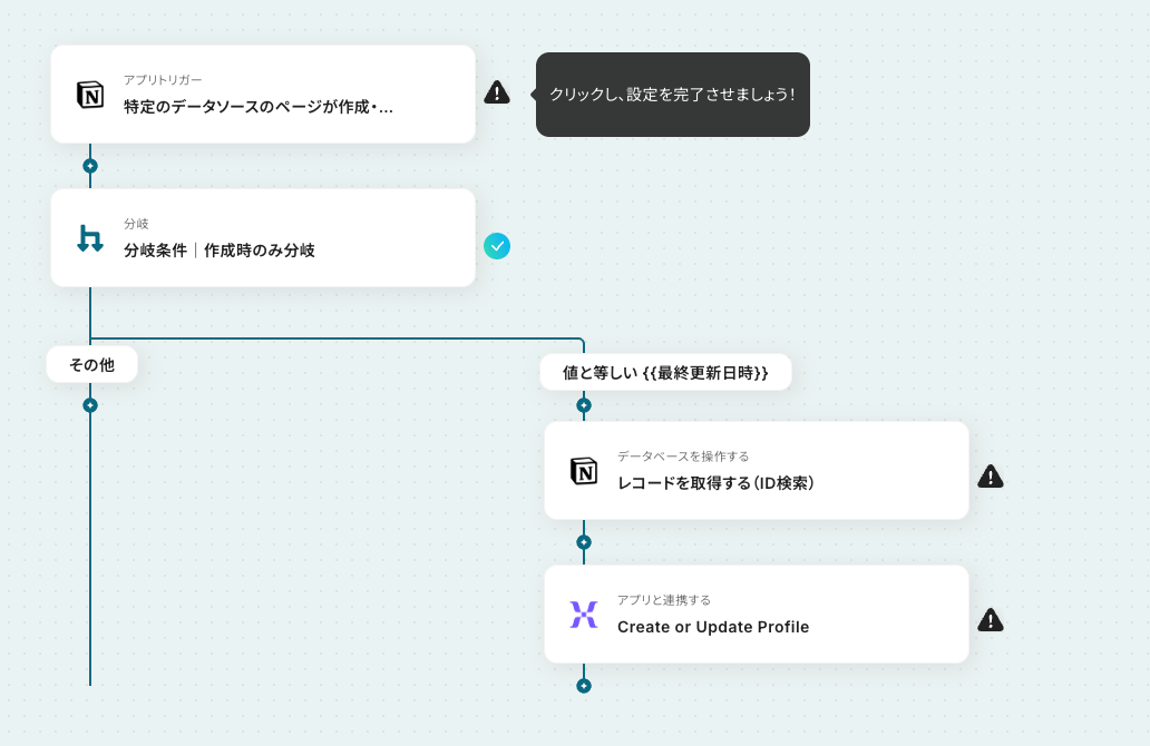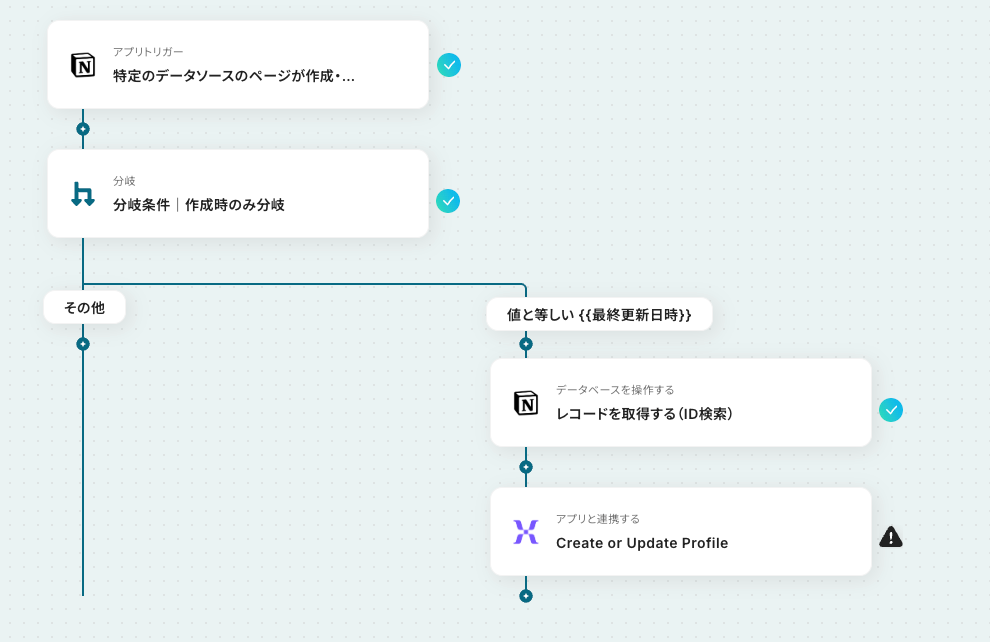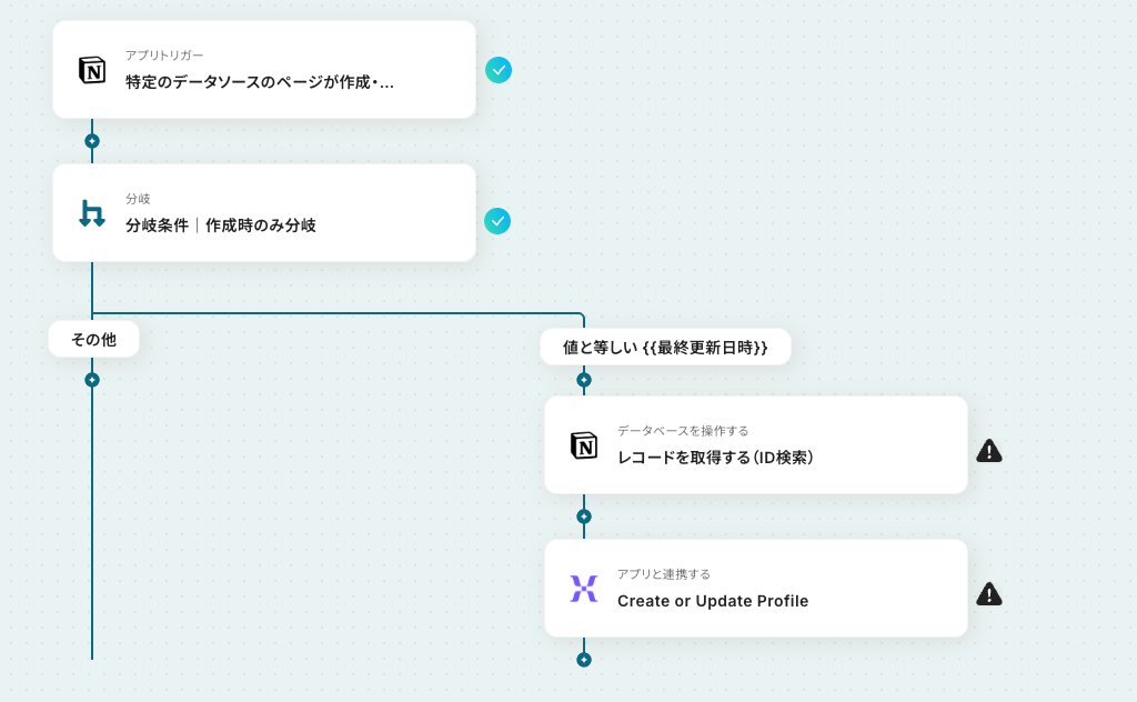 今回は「Notionでレコードが追加されたら、MixpanelでProfileを作成する」フローを作成していきます!作成の流れは大きく分けて以下です。