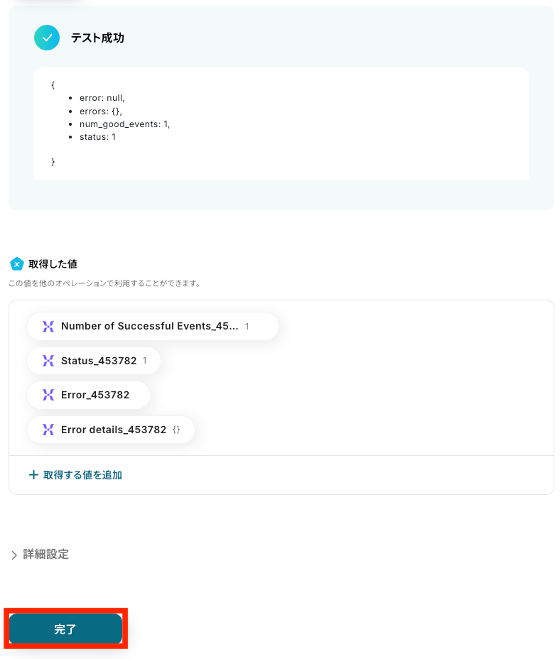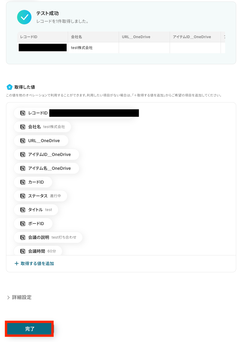 テストが成功したら、データが正しく取得されているか確認し、「完了」をクリックします。