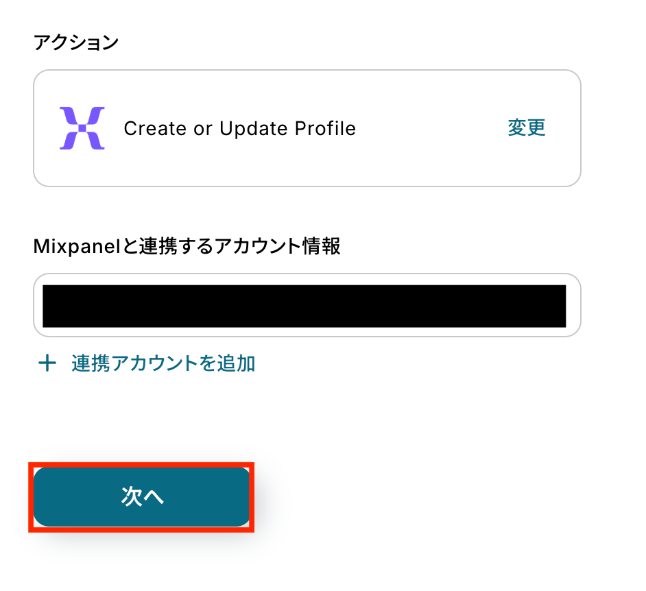 - 最後に、オペレーションでMixpanelの「Create or Update Profile」アクションを設定し、抽出した情報を用いてプロファイルを作成または更新します