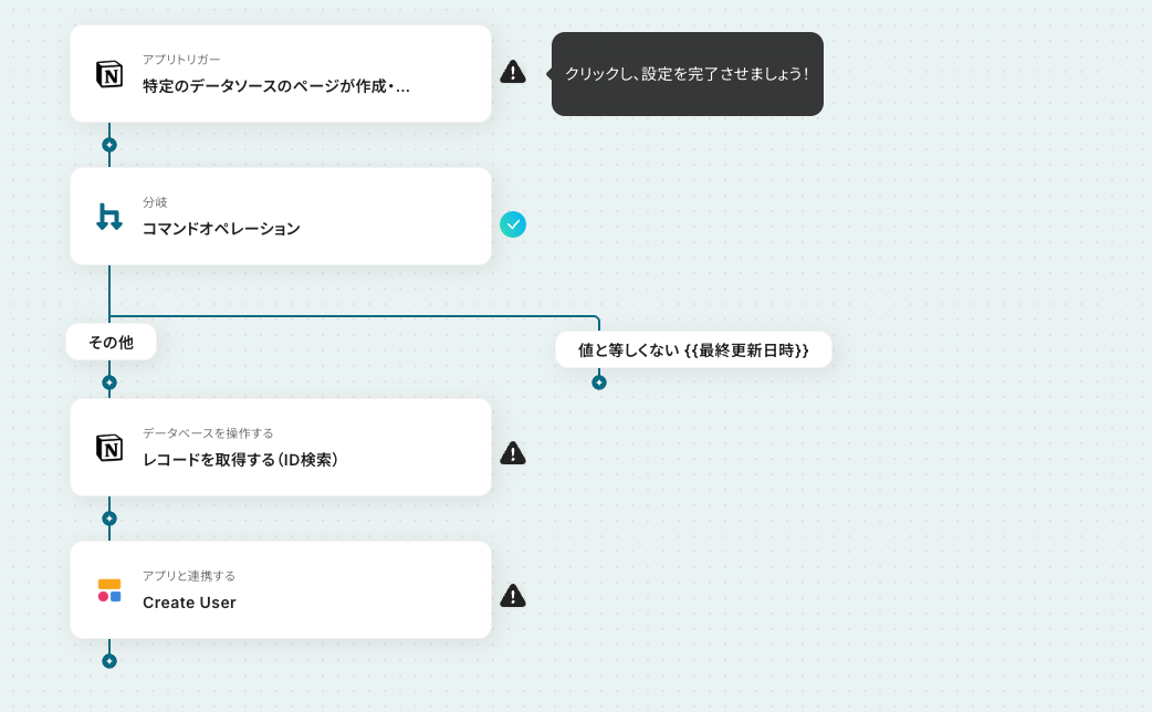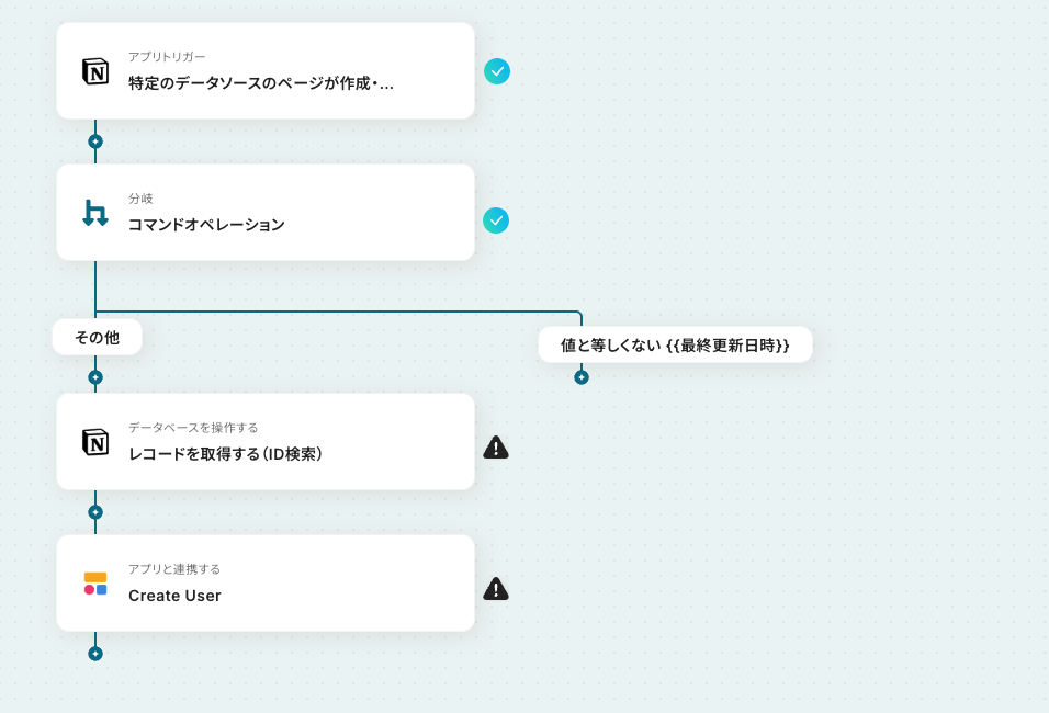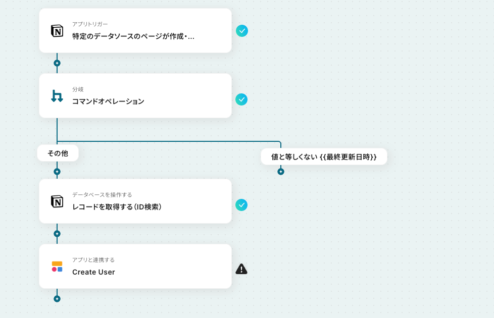 今回のフローにおいて、Notionのトリガーは「特定のデータソースのページが作成・更新された」ときに起動します。 そのままでは既存レコードを更新した場合にもフローが動いてしまうため、不要なユーザー作成が発生してしまう可能性があります。