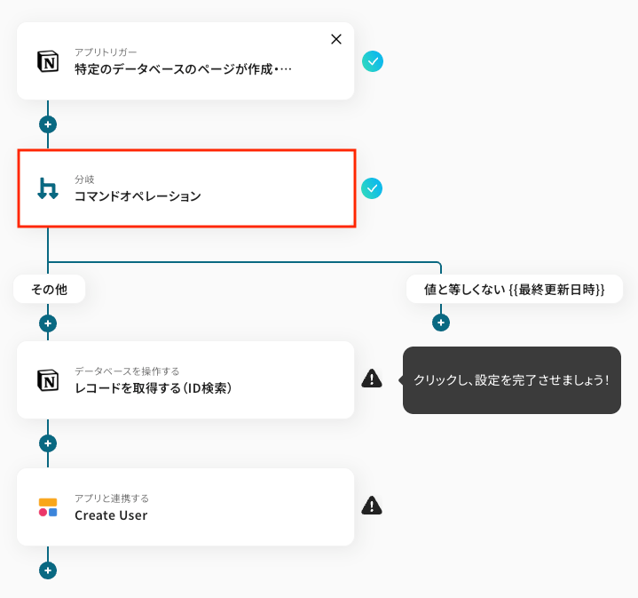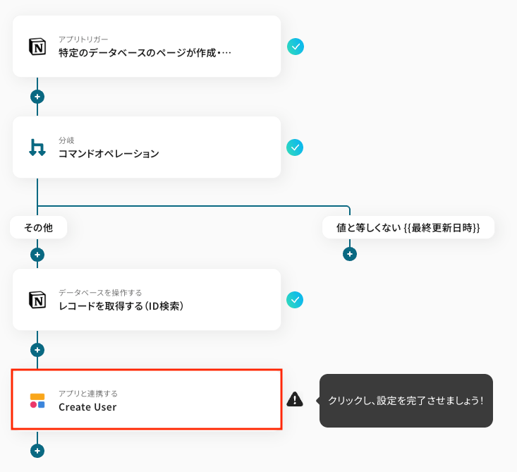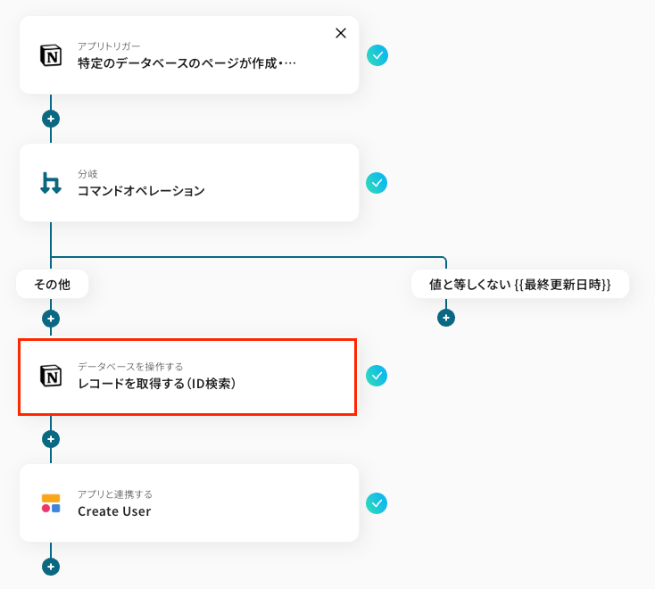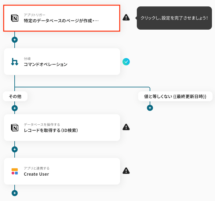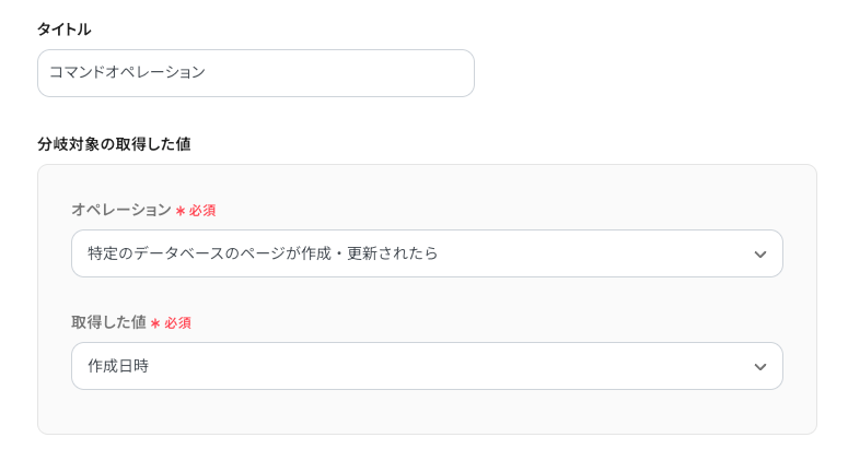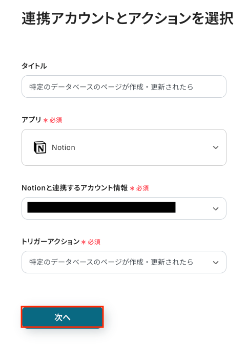 今回のフローにおいて、Notionのトリガーは「特定のデータベースのページが作成・更新された」ときに起動します。