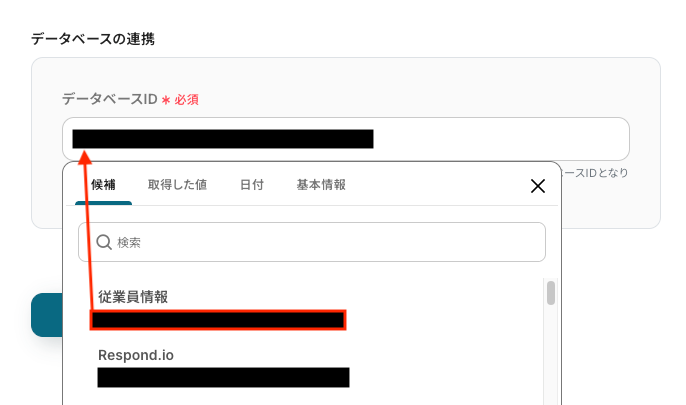 連携するデータベースを設定します。 入力欄をクリックすると、連携が有効になっているアカウントから候補が表示されるので、ステップ3でテスト用に従業員情報を追加したデータソースIDと同じものを選択しましょう。